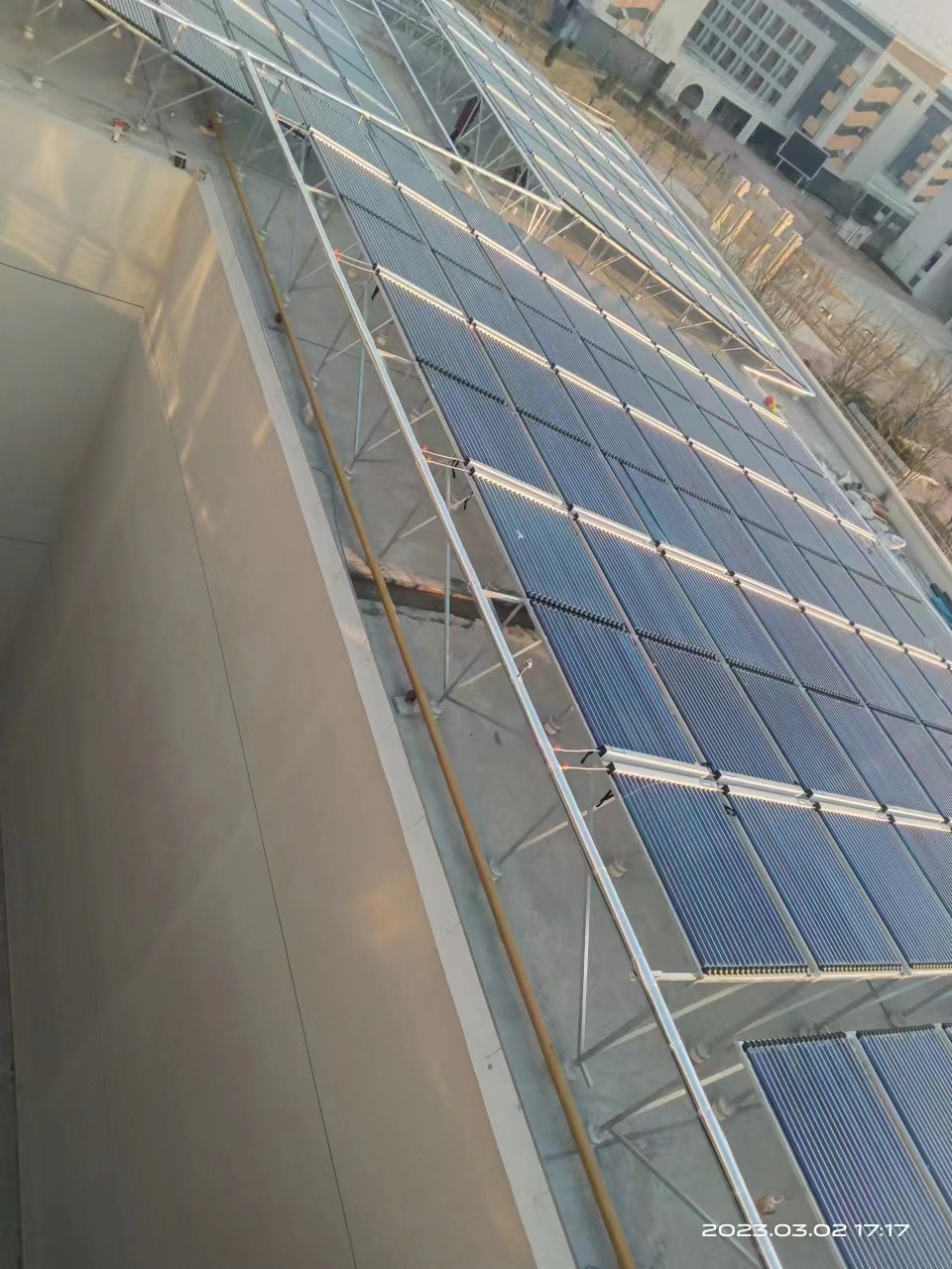 太陽能集熱工程是由集熱器、保溫水箱、控制系統(tǒng)、自動上水控制箱、循環(huán)泵、管路配件等有機組合而成的集熱供水系統(tǒng)。